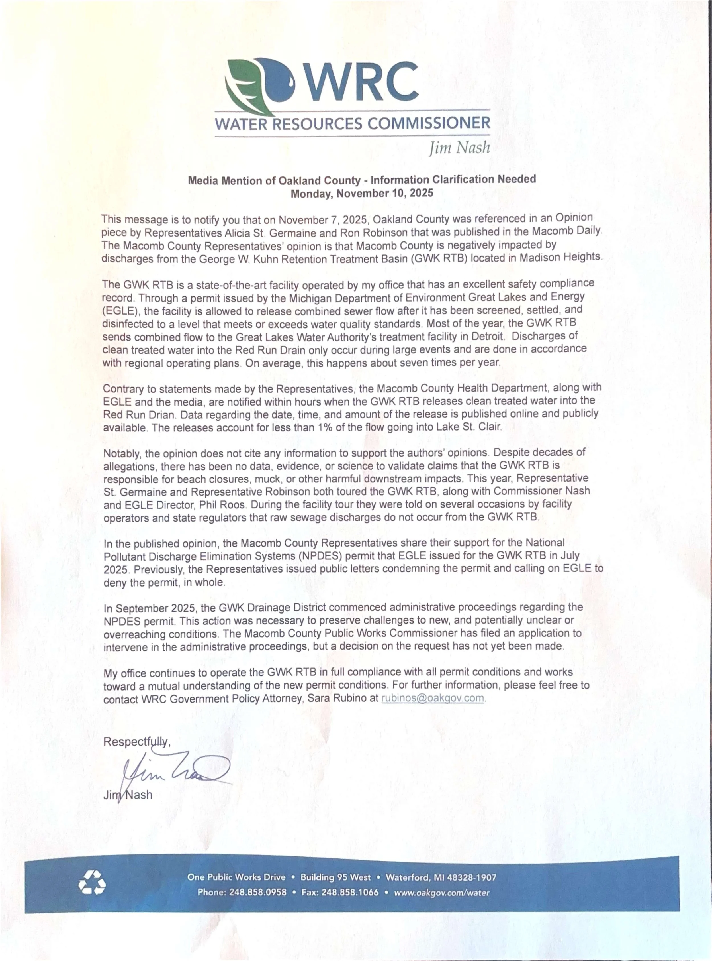 EGLE finally issued a June 27 enforcement notice to the Oakland County Water Resources Commissioner’s Office citing violations of the state’s Natural Resources and Environmental Protection Act, including a massive discharge of 1.18 million gallons of untreated sewage in April and more than 2 million gallons in August of last year. The state now plans to impose an Administrative Consent Order requiring corrective action, financial penalties, and potentially further legal consequences if violations continue.